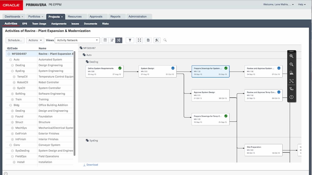 | Çizelgeleme | P6 CPM -Kritik Yol Metoduna dayalı çizelgeme algoritmasının yanısıra, kaynak dengeleme ve birden fazla bolluk yolu belirleme gibi analiz yöntemleri sunar. Projedeki gecikmeleri ve nedenlerini anlamanızı sağlayan planlar üretmenizi sağlar. |