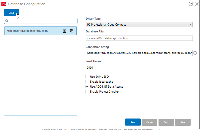 Driver Type olarak "P6 Professional Cloud Connect" seçiniz.