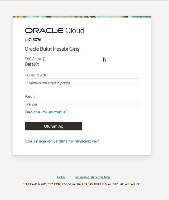 Kullanıcı adı ve şifreniz ile giriş yapınız. (Şifrenizi, size Oracle Cloud tarafından gönderilen bir şifre belirleme e-postasındaki talimatları takip ederek belirlemiş olmalısınız.)